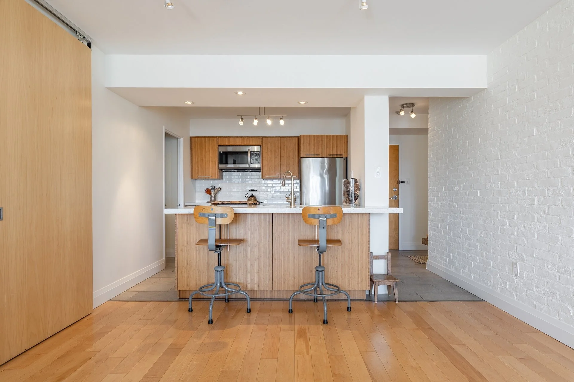 Hardwood floors and integrated millwork create a cohesive interior, while the updated kitchen anchors the living space with a centre island, bamboo cabinetry, stainless steel appliances, and generous preparation space. Natural light moves easily through the combined living and dining areas, framed by floor to ceiling south facing windows and a walkout to a large private balcony.